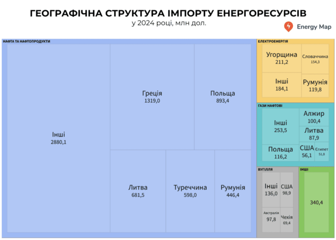 Зокрема, нафти та нафтопродуктів (крім сирих) у 2024 році Україна імпортувала 7,56 млн тонн загальною вартістю 6,82 млрд доларів. Основні постачальники - Греція (19,3%), Польща (13,1%), Литва (10,0%) і Туреччина (8,8%).
