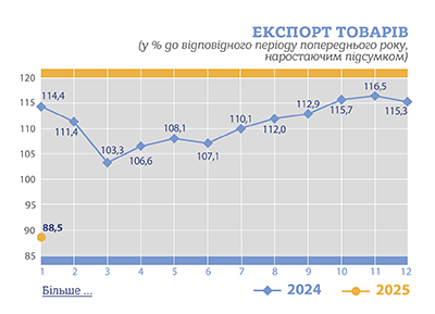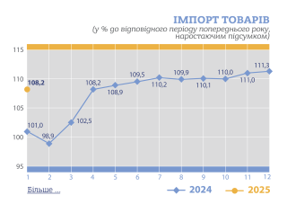 «За січень 2025 року експорт товарів становив 3 179,7 млн дол. США, або 88,5% порівняно із січнем 2024 року, імпорт – 5 514,8 млн дол., або 108,2%», - йдеться в повідомленні.