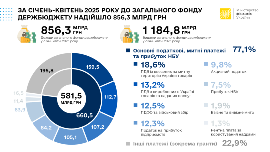 Зазначається, що за січень-квітень 2025 року до загального фонду державного бюджету надійшло 856,3 млрд грн.