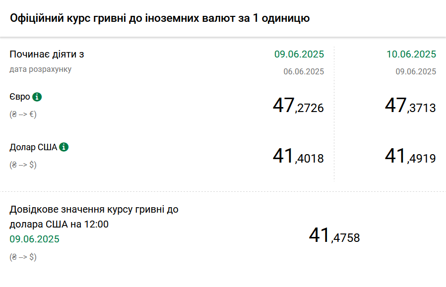 1 євро — 47,37 грн (47,27 грн станом на 9 червня).