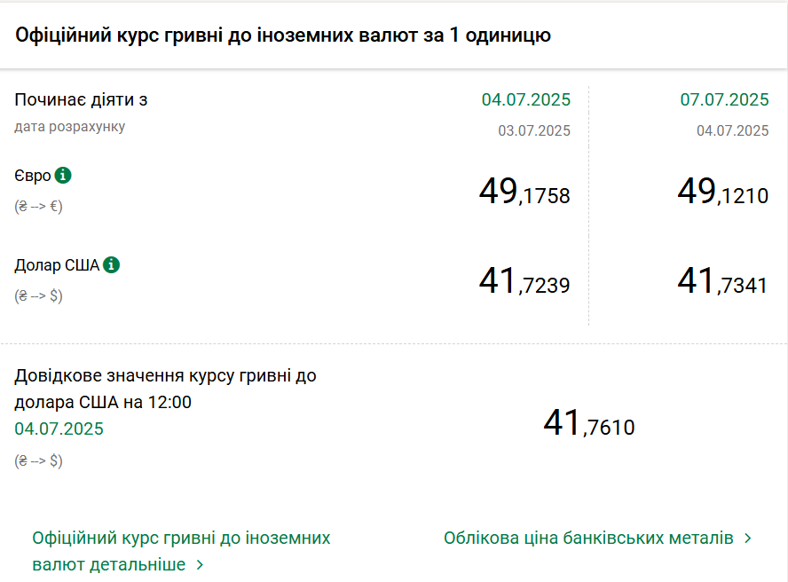 Офіційні курси на понеділок, 7 липня, становитимуть:
