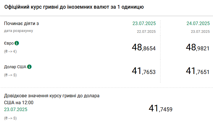 1 долар США - 41,76 грн (41,76 грн станом на 23 липня);