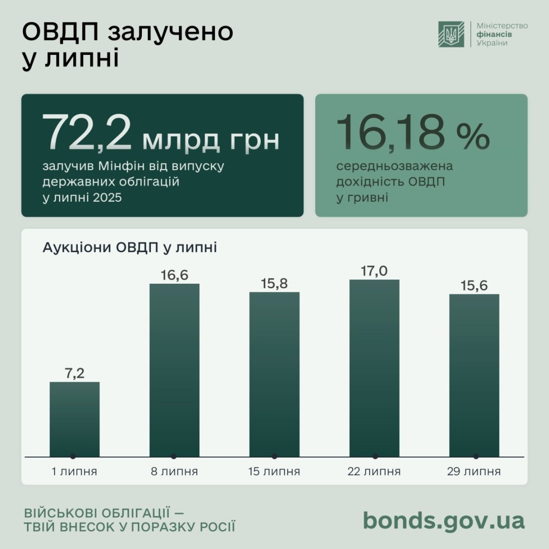 "У липні 2025 року Міністерство фінансів України залучило до державного бюджету 72,2 млрд грн від розміщення облігацій внутрішньої державної позики (далі - ОВДП). Це майже вдвічі більше, ніж у червні (37,1 млрд грн)", - йдеться в повідомленні.