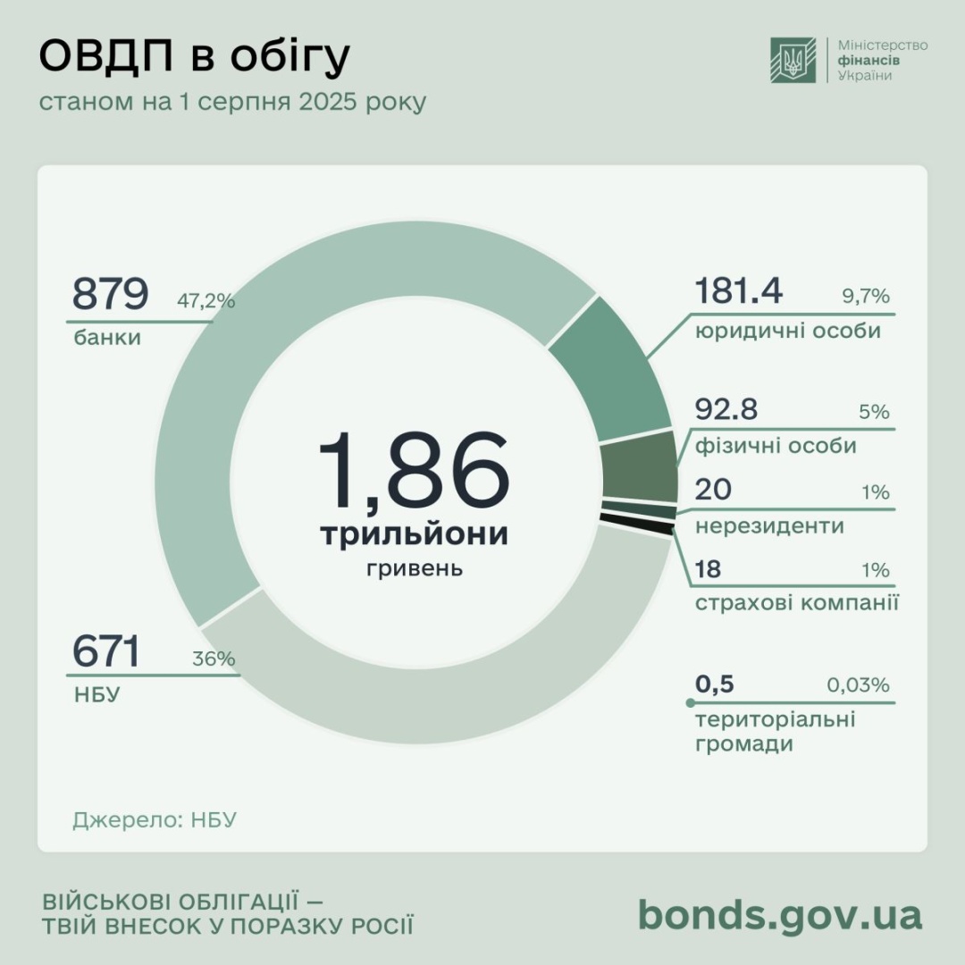 Зазначається, що станом на 1 серпня в обігу перебувають державні облігації на понад 1,86 трлн грн. Найбільшими власниками залишаються комерційні банки (47,2%) та НБУ (36%), тоді як частка юридичних осіб становить 9,7%, а фізичних осіб – 5%.