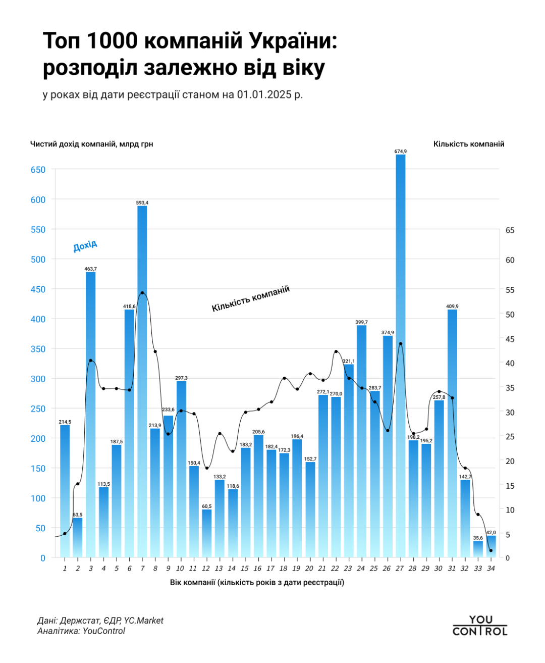Серед тисячі найбільших компаній України у 2024 році переважають підприємства віком від 3 до 10 років - саме такого віку понад третина компаній. Це свідчить про активний розвиток бізнесу, започаткованого після 2014 року.