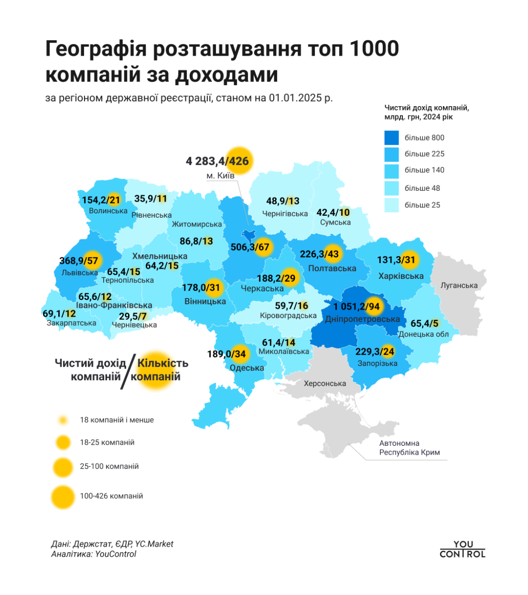 Переважна більшість компаній із топ-1000 зареєстровані в Києві - 426, на них припадають 52% загального доходу учасників дослідження. Ще 26% чистого доходу від реалізації продукції згенерували великі підприємства з промислових центрів Дніпропетровської, Київської, Львівської та Запорізької областей.