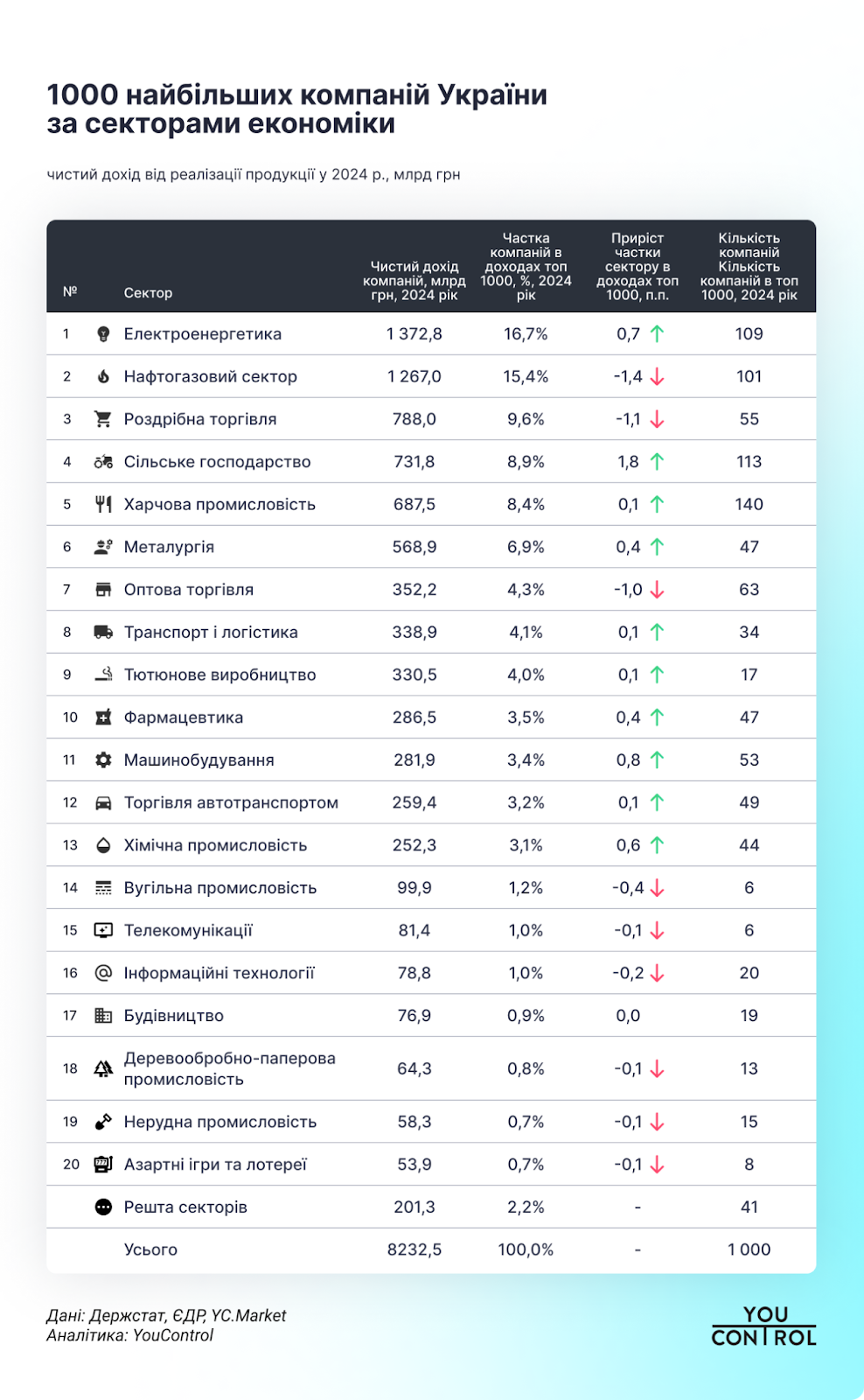 За даними аналітиків, перше місце за обсягом чистих доходів зайняла електроенергетика (майже 1,4 трлн грн, або 16,7% загальних доходів топ-1000), яка за підсумками 2024 року обійшла нафтогазовий сектор, залишивши його на другому місці (15,4%).