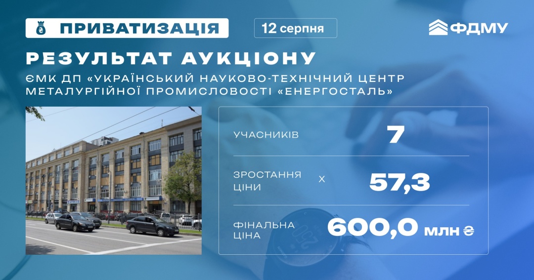 «600 млн грн — результат онлайн-аукціону з приватизації єдиного майнового комплексу державного підприємства «Український науково-технічний центр металургійної промисловості «Енергосталь» у Харкові», - йдеться в повідомленні.