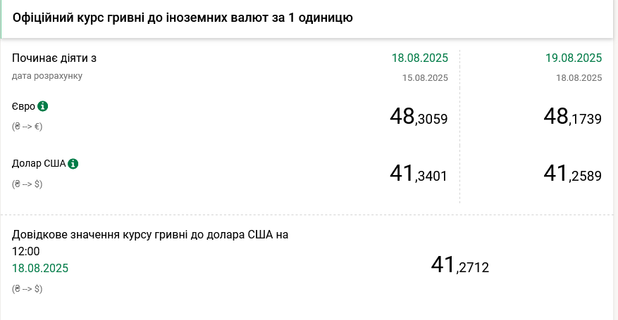 1 долар США - 41,25 грн (41,34 грн станом на 18 серпня);