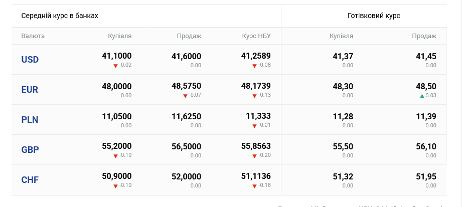 monobank: 41,20 - 41,60 грн/$ та 48,00 - 48,69 грн/EUR.