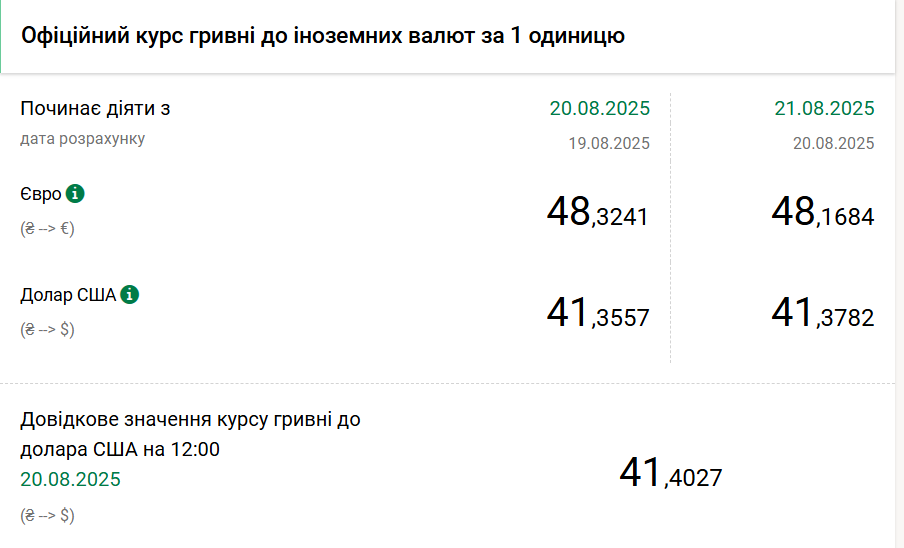 - 1 долар США - 41,37 грн (41,35 грн станом на 20 серпня);