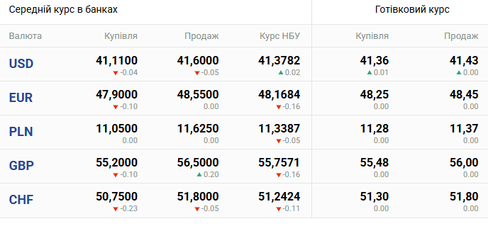 - monobank: 41,20 - 41,60 грн/$ та 47,84 - 48,53 грн/EUR.