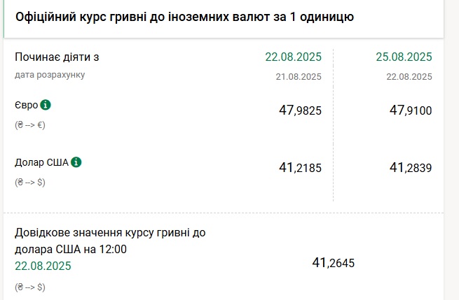 - 1 долар США - 41,28 грн (41,21 грн станом на 22 серпня)
