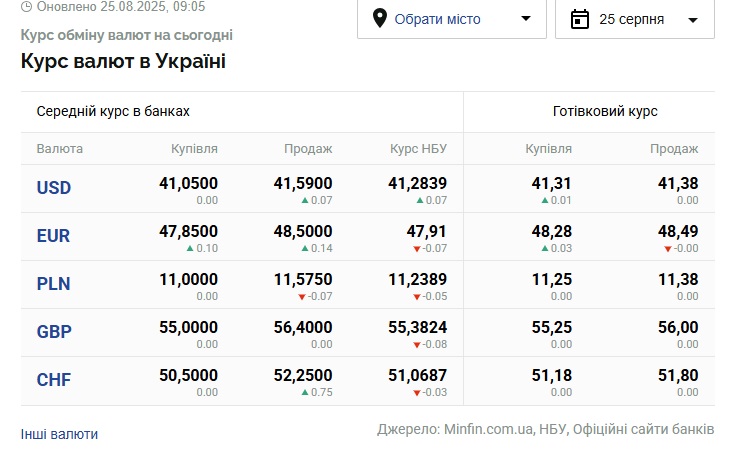 - monobank: 41,20 - 41,64 грн/$ та 48,00 - 48,77 грн/EUR