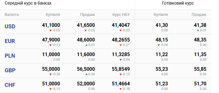 - monobank: 41,20 - 41,64 грн/$ та 47,88 - 48,52 грн/EUR.