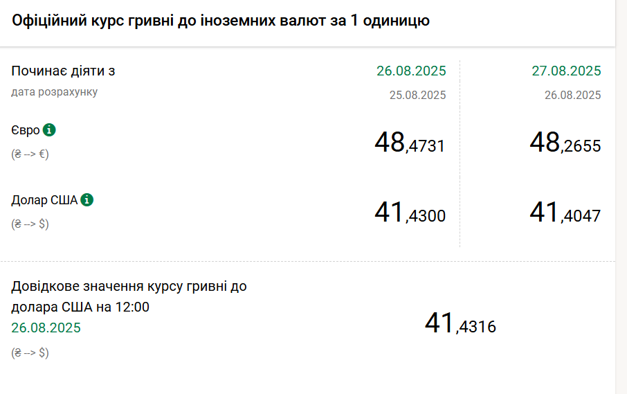 - 1 долар США - 41,40 грн (41,43 грн станом на 26 серпня);