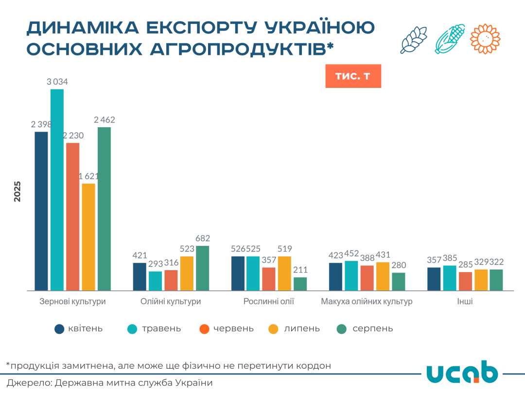 Так, у серпні Україна експортувала 2,5 млн т зернових (частка кукурудзи у загальній структурі - 10%, пшениці - 77% та ячменю - 13%), що на 52% більше, ніж у липні 2025 року.