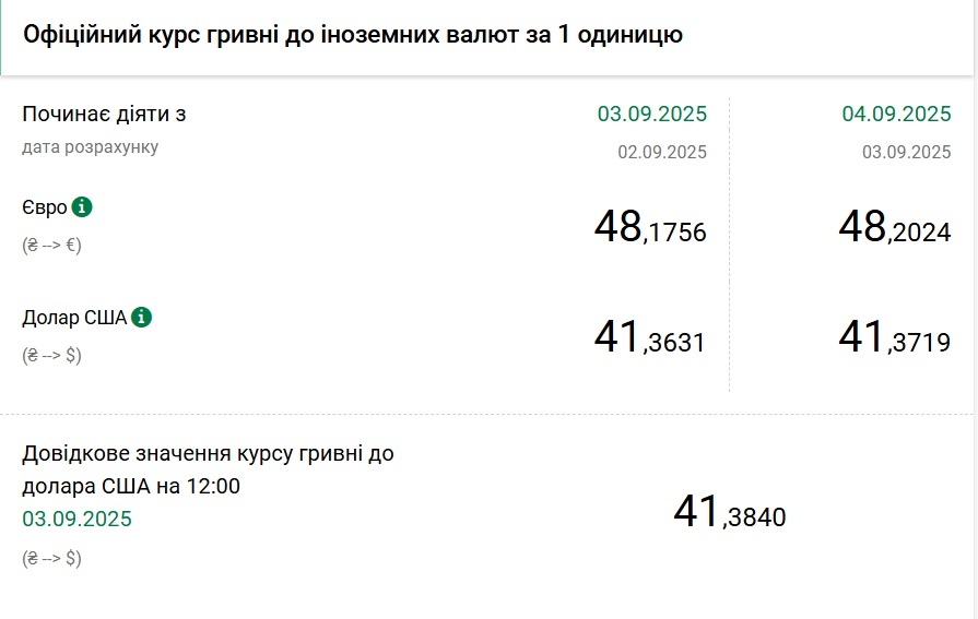 1 долар США - 41,37 грн (41,36 грн станом на 3 вересня);