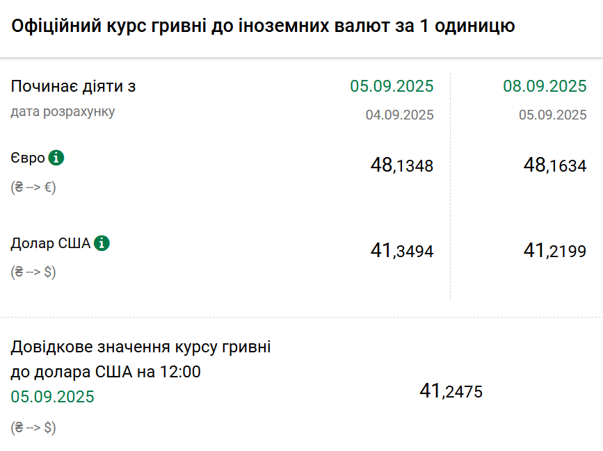 1 долар США - 41,21 грн (41,34 грн станом на 5 вересня);