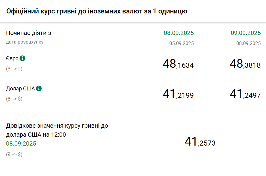 - 1 долар США - 41,24 грн (41,21 грн станом на 8 вересня);