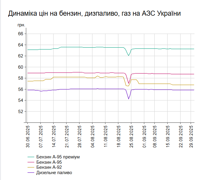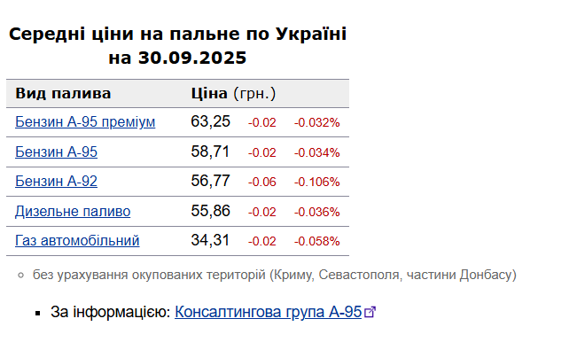 Зокрема, зафіксовано такі середні ціни на пальне: бензин марки А-95 (преміум) - 63,25 грн/л (здешевшав на 2 коп.); бензин марки А-95 - 58,71 грн/л (здешевшав на 2 коп.); бензин марки А-92 - 55,77 грн/л (здешевшав на 6 коп.); дизельне пальне - 55,86 грн/л (здешевшало на 2 коп.). Середня ціна автогазу становить 34,31 грн/л, що на 2 коп. менше порівняно із попереднім днем.