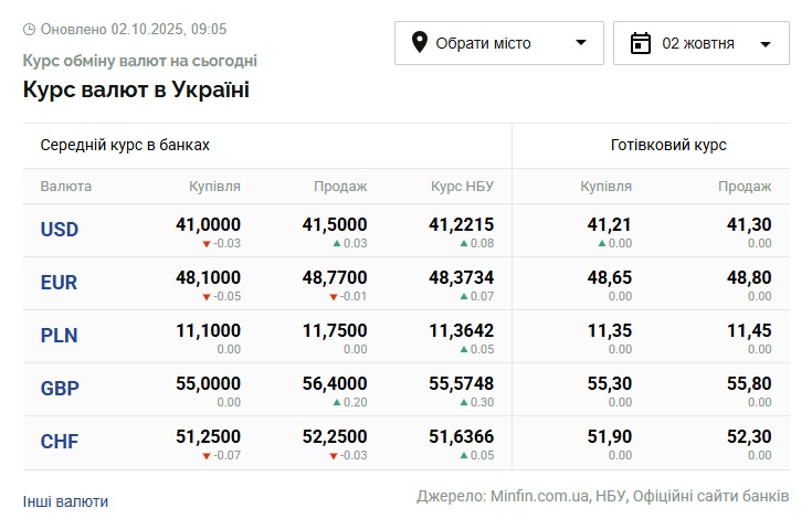 - 1 долар США - 41,22 грн (41,14 грн станом на 1 жовтня)