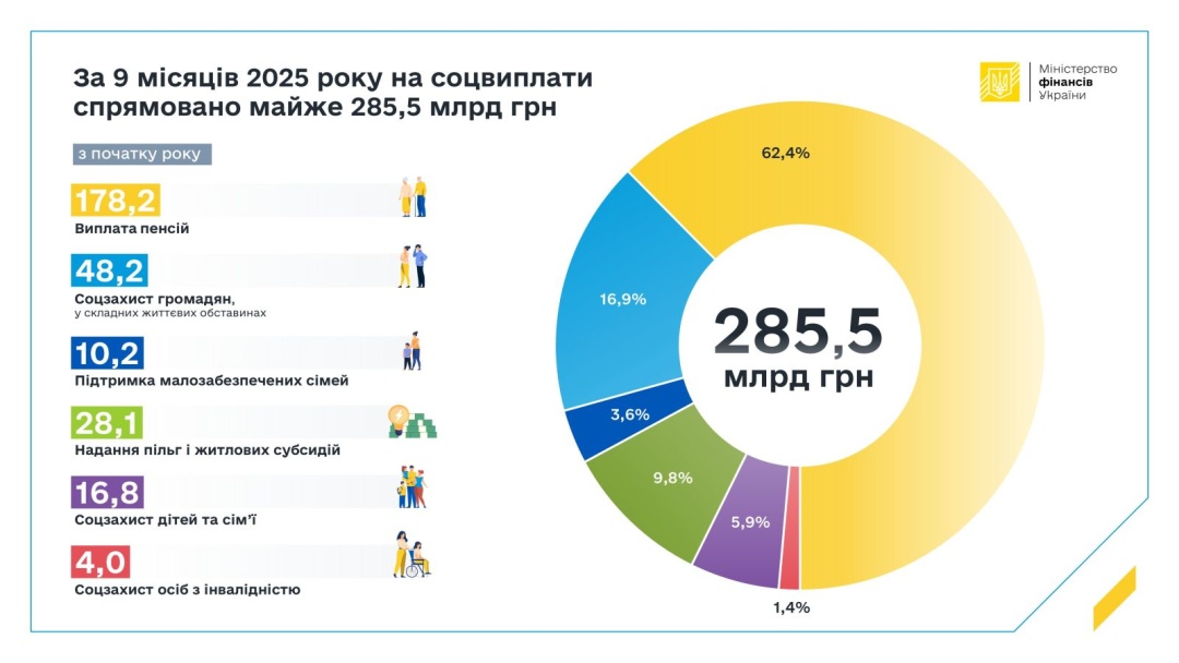 Зазначається, що за дев'ять місяців 2025 року із держбюджету на соцвиплати, що здійснюється Мінсоцполітики, 178,2 млрд грн було використано на фінансове забезпечення виплати пенсій, надбавок та підвищень до пенсій.