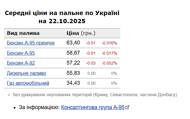 Як повідомлялося, у вівторок, 21 жовтня, середня ціна на бензин марки А-95 знизилася на 1 коп. до 58,68 грн/л, на дизельне пальне - на 2 коп. до 55,83 грн/л.
