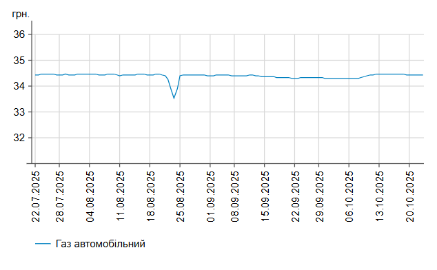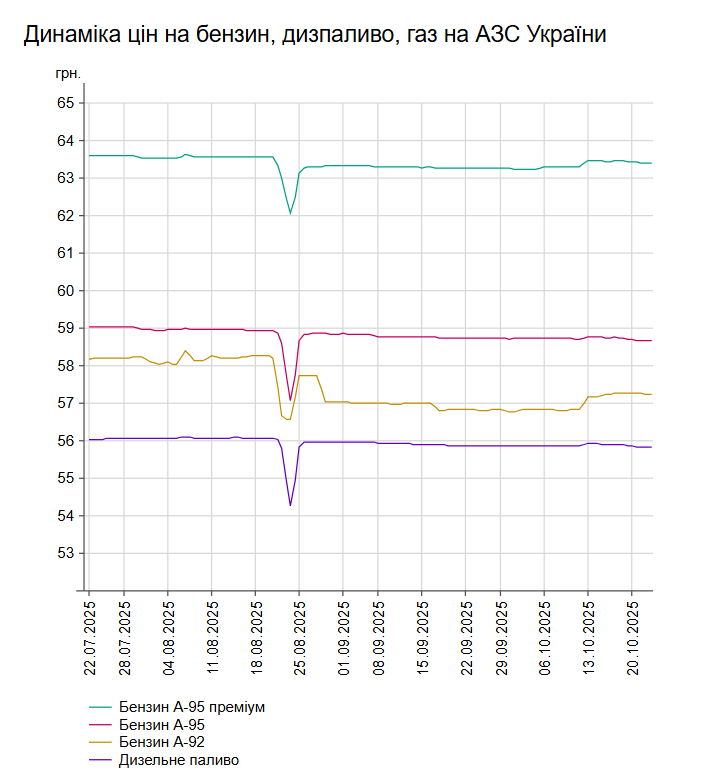 Зокрема, зафіксовано такі середні ціни на пальне: бензин марки А-95 (преміум) - 63,4 грн/л (здешевшав на 1 коп.); бензин марки А-95 - 58,67 грн/л (здешевшав на 1 коп.); бензин марки А-92 - 57,22 грн/л (здешевшав на 3 коп.); дизельне пальне - 55,83 грн/л. Середня ціна автогазу становить 34,43 грн/л - на рівні попереднього дня.