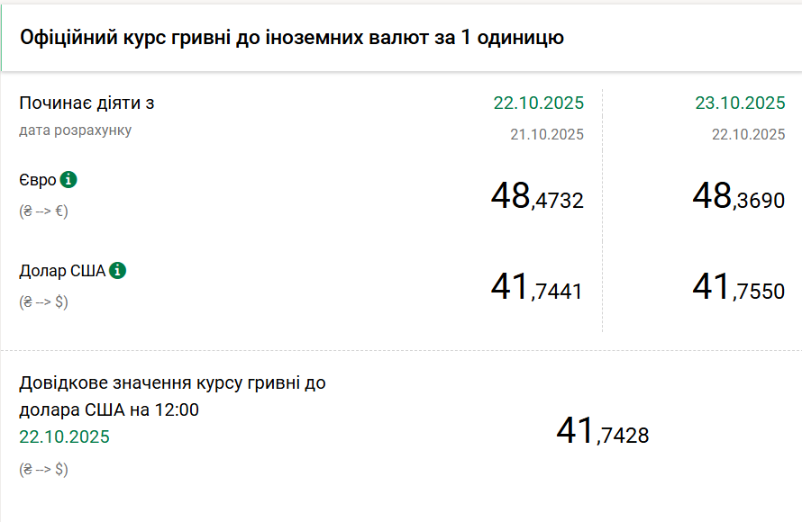 - 1 долар США - 41,75 грн (41,74 грн станом на 22 жовтня);