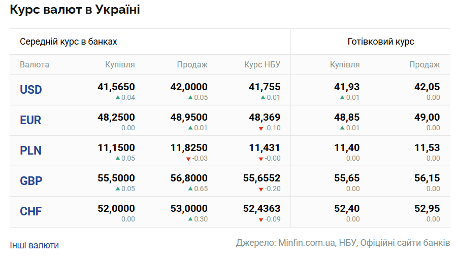 - у monobank: 41,57 - 42,00 грн/$ та 48,22 - 48,91 грн/EUR.