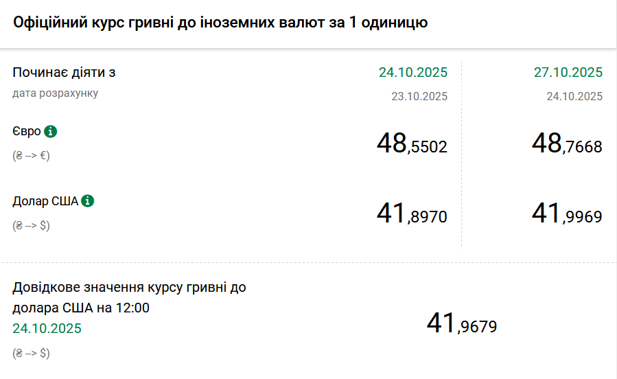 1 долар США - 41,99 грн (41,89 грн станом на 24 жовтня);