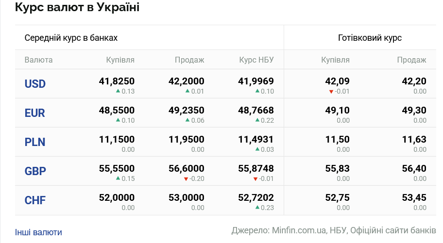 у monobank: 41,77 - 42,17 грн/$ та 48,55 - 49,24 грн/EUR.