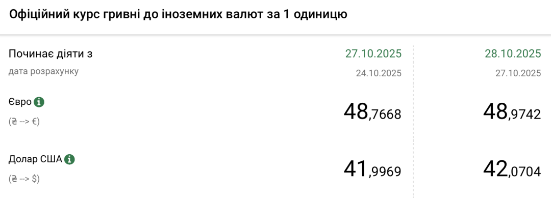 - 1 долар США - 42,07 грн (41,99 грн станом на 27 жовтня);