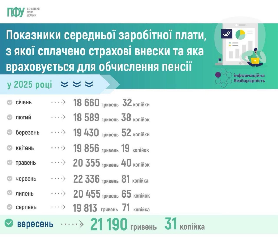«27 жовтня 2025 року затверджено показник середньої заробітної плати (доходу) в Україні, з якої сплачено страхові внески та яка відповідно до Закону України “Про загальнообов’язкове державне пенсійне страхування” враховується для обчислення пенсії, за вересень 2025 року. Він становить 21 190 гривень 31 копійка», - йдеться у повідомленні.