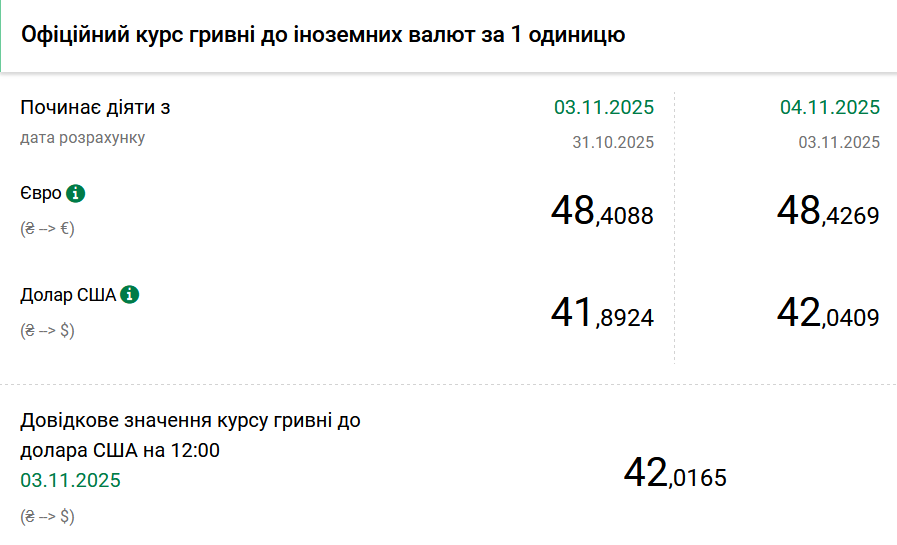 - 1 долар США - 42,04 грн (41,89 грн станом на 3 листопада);