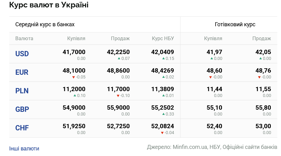 - у monobank: 41,78 - 42,17 грн/$ та 48,11 - 48,77 грн/EUR.