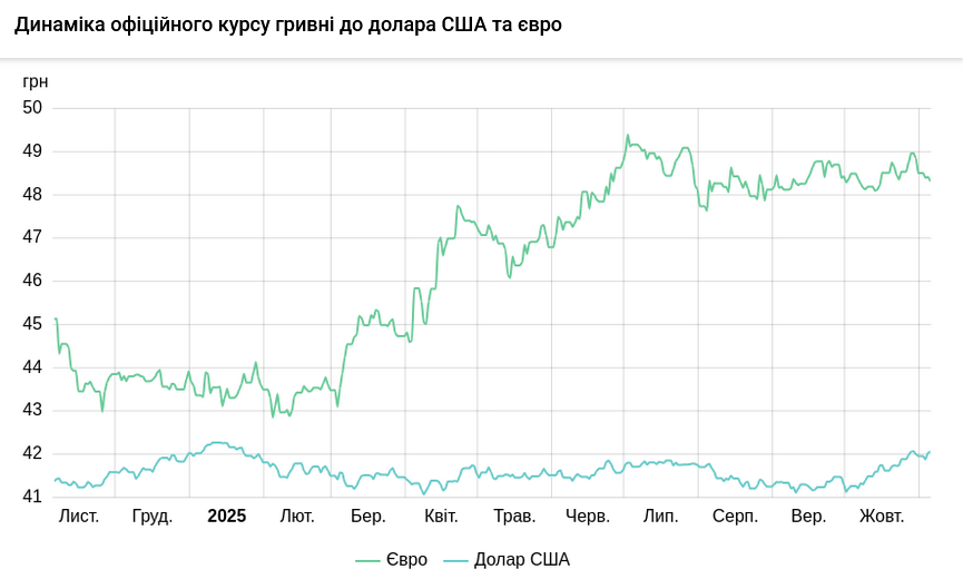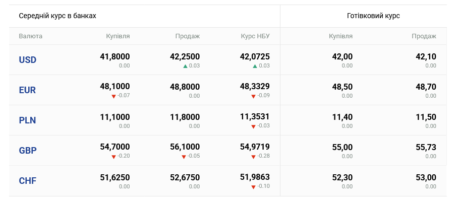у monobank: 41,82 - 42,18 грн/$ та 48,04 - 48,74 грн/EUR.
