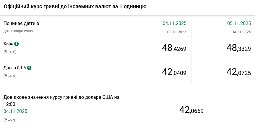 1 долар США - 42,07 грн (42,04 грн станом на 4 листопада);