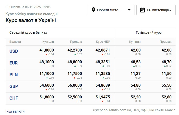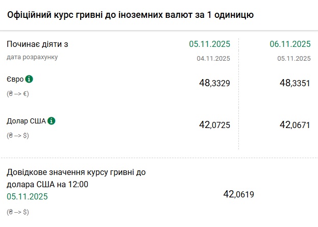 - 1 долар США - 42,06 грн (42,07 грн станом на 5 листопада)