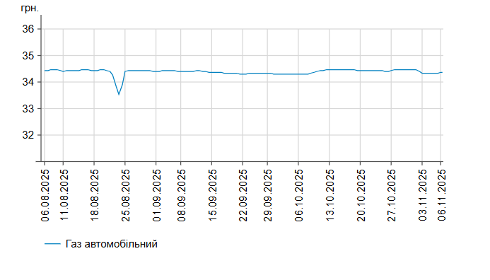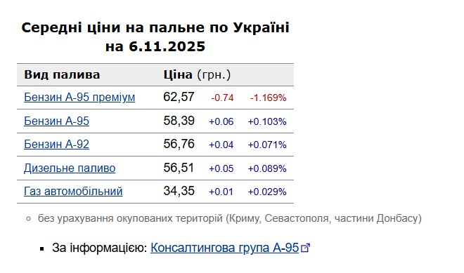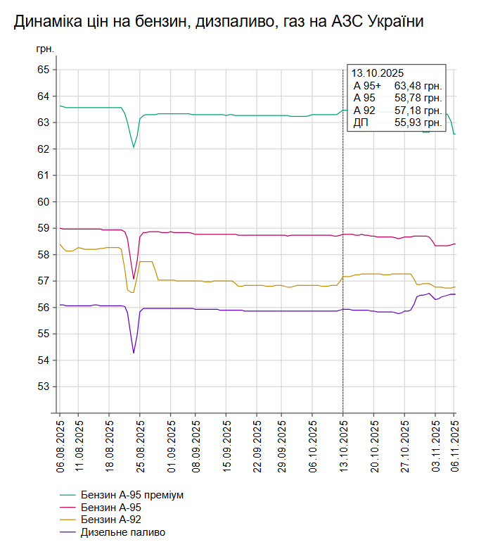 Зокрема, зафіксовано такі середні ціни на пальне: бензин марки А-95 (преміум) - 62,57 грн/л (здешевшав на 74 коп.); бензин марки А-95 - 58,39 грн/л (здорожчав на 6 коп.); бензин марки А-92 - 56,76 грн/л (здорожчав на 4 коп.); дизельне пальне - 56,51 грн/л (здорожчало на 5 коп.). Середня ціна автогазу становить 34,35 грн/л, що на 1 коп. дорожче порівняно із попереднім днем.
