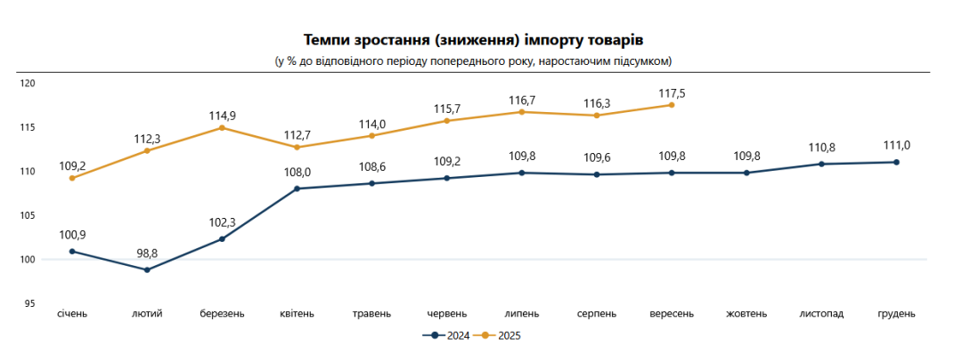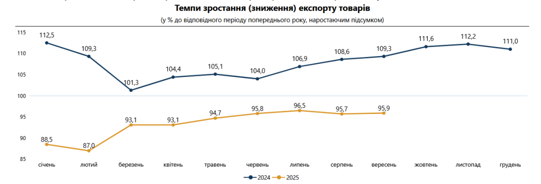 «За 9 місяців 2025 року експорт товарів становив 29 572,1 млн дол. США, або 95,9% порівняно із 9 місяцями 2024 року, імпорт – 60 191,0 млн дол., або 117,5%», - йдеться в повідмоленні.