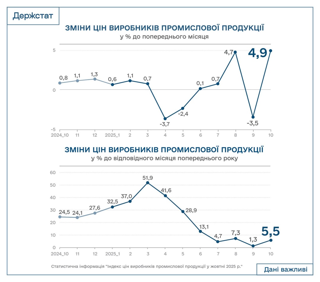 За даними Держстату, у жовтні індекс цін виробників промислової продукції (показник середнього рівня зміни відпускних оптових цін на сировину, матеріали та товари проміжного споживання) порівняно з вереснем збільшився на 4,9%, тоді як місяць тому він демонстрував спадну динаміку.