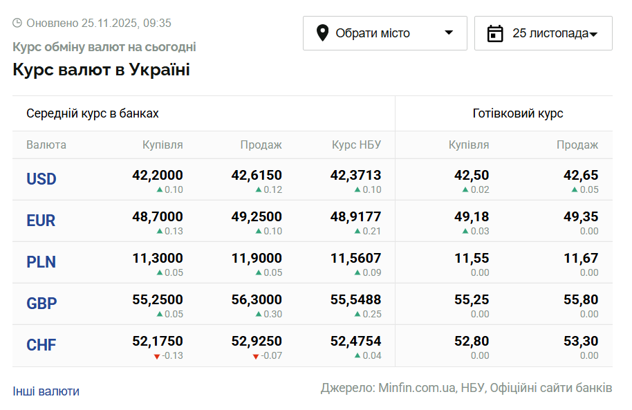 у monobank: 42,20 - 42,54 грн/$ та 48,66 - 49,24 грн/EUR.