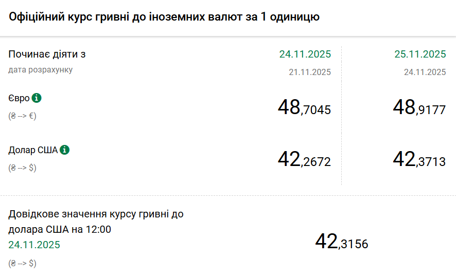 1 долар США - 42,37 грн (42,26 грн станом на 24 листопада);