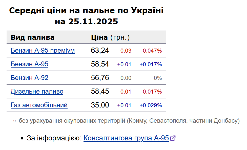 Як повідомлялось, у понеділок, 24 листопада, середня ціна на бензин марки А-95 зросла на 2 коп. до 58,53 грн/л, на дизельне пальне - на 5 коп. до 58,46 грн/л. https://www.ukrinform.ua/rubric-economy/4062259-benzin-dizpalne-ta-avtogaz-aki-cini-24-listopada-na-azs-ukraini.html