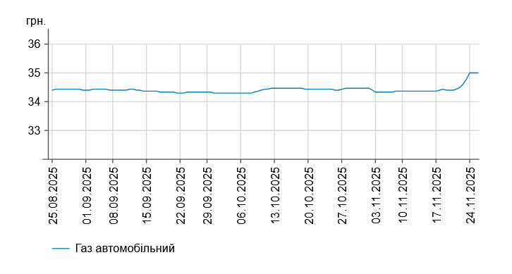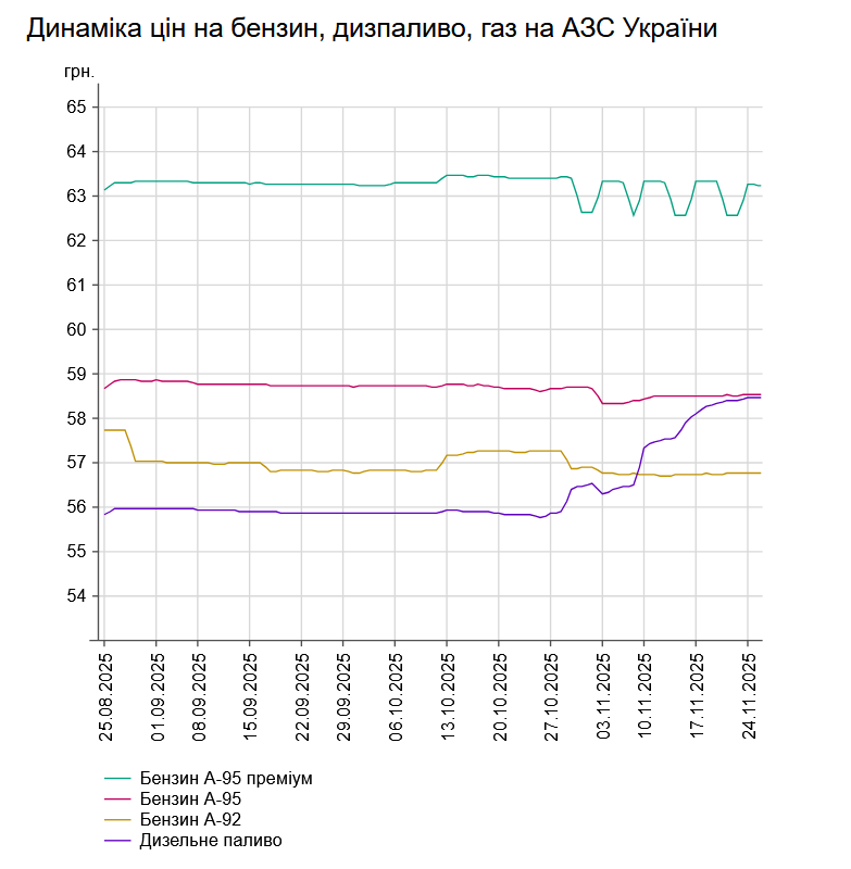 Зокрема, зафіксовано такі середні ціни на пальне: бензин марки А-95 (преміум) - 63,24 грн/л (здешевшав на 3 коп.); бензин марки А-95 - 58,54 грн/л (здорожчав на 1 коп.); бензин марки А-92 - 56,76 грн/л; дизельне пальне - 58,45 грн/л (здешевшало на 1 коп.). Середня ціна автогазу становить 35,00 грн/л - на 1 коп. більше, ніж попереднього дня.