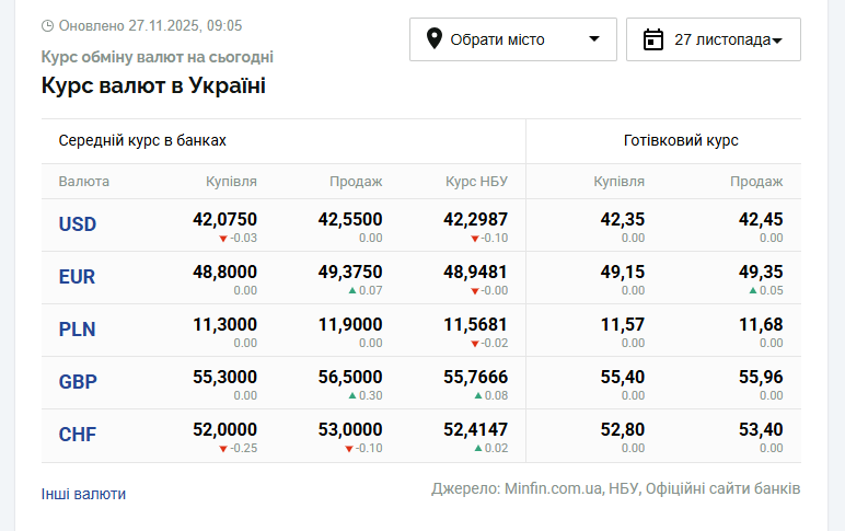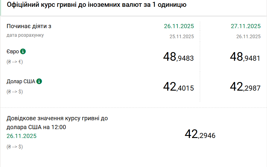 - 1 долар США - 42,29 грн (42,40 грн станом на 26 листопада);