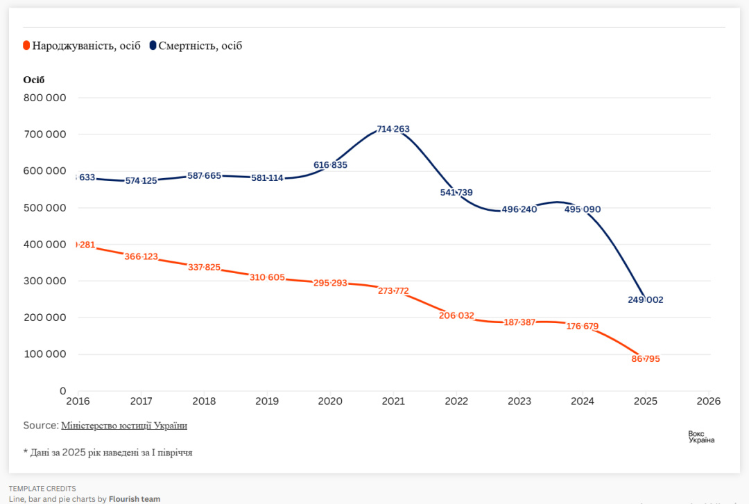 Як і в розвинених європейських країнах, в Україні смертність перевищує народжуваність, а населення неухильно старіє. Війна погіршила ці довгострокові тренди. Наприклад, у 2024 році рівень смертності втричі перевищував кількість народжень. Частково це пояснюється тим, що жінки репродуктивного віку відкладають народження дітей через невизначеність і небезпеку, а частково – тим, що значна частина потенційних матерів виїхала за кордон у безпечніші країни.