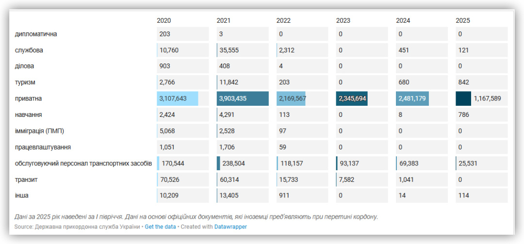 Як і до війни, більшість іноземців приїжджає з особистих причин (рис. 4), наприклад, для возз’єднання з родинами (таких у 2020 році був 91%, а станом на І півріччя 2025 року 98%), ще частина по службі або для навчання, і найменше – для роботи.